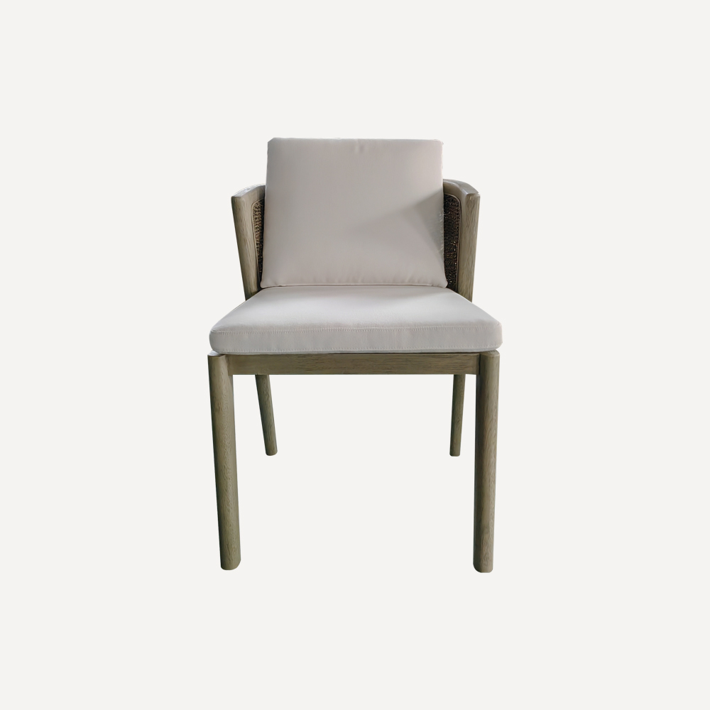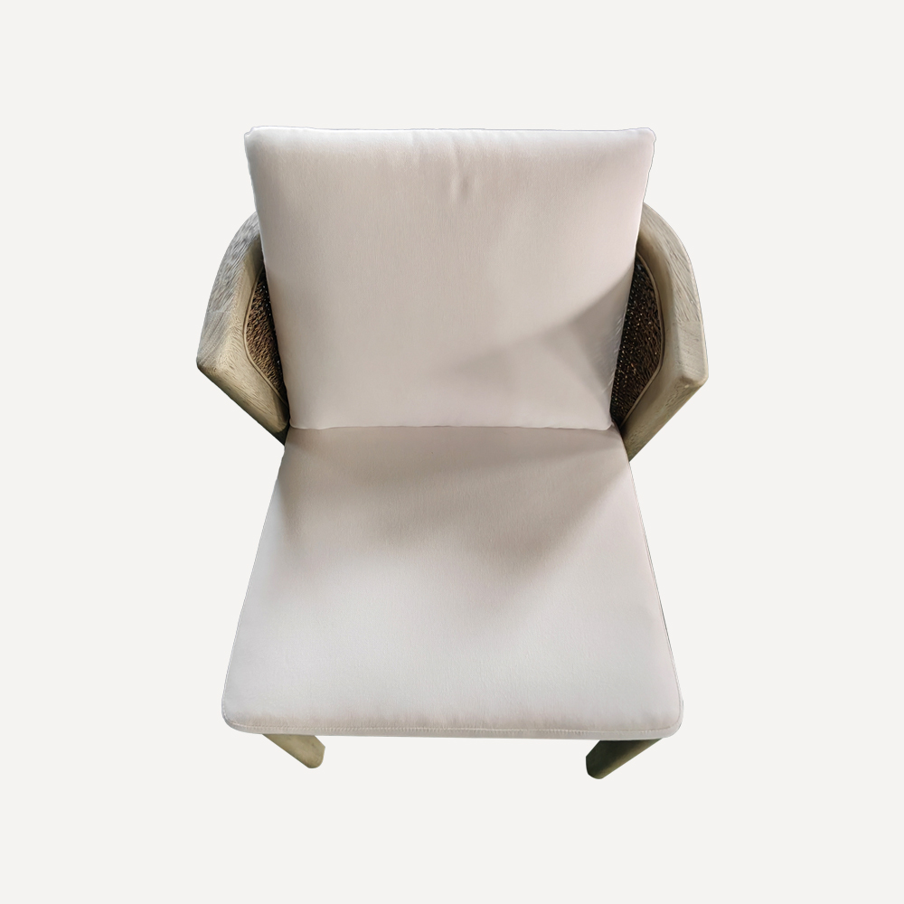 Each armchair features ergonomic armrests and is upholstered with premium waterproof outdoor fabric, providing long-lasting weather protection. The seat cushion uses breathable outdoor drainage foam, allowing water to pass through and dry quickly, while the backrest is filled with high-quality waterproof padding imported from the U.S., offering medium-firm support and maintaining its shape even after prolonged use.