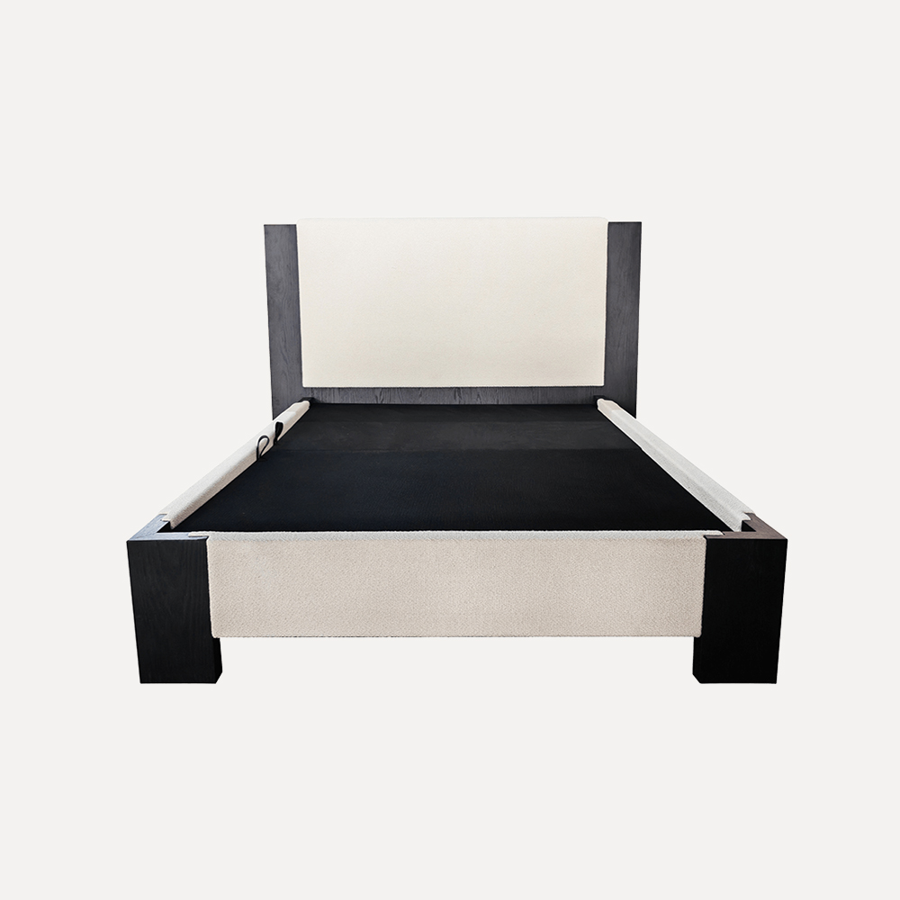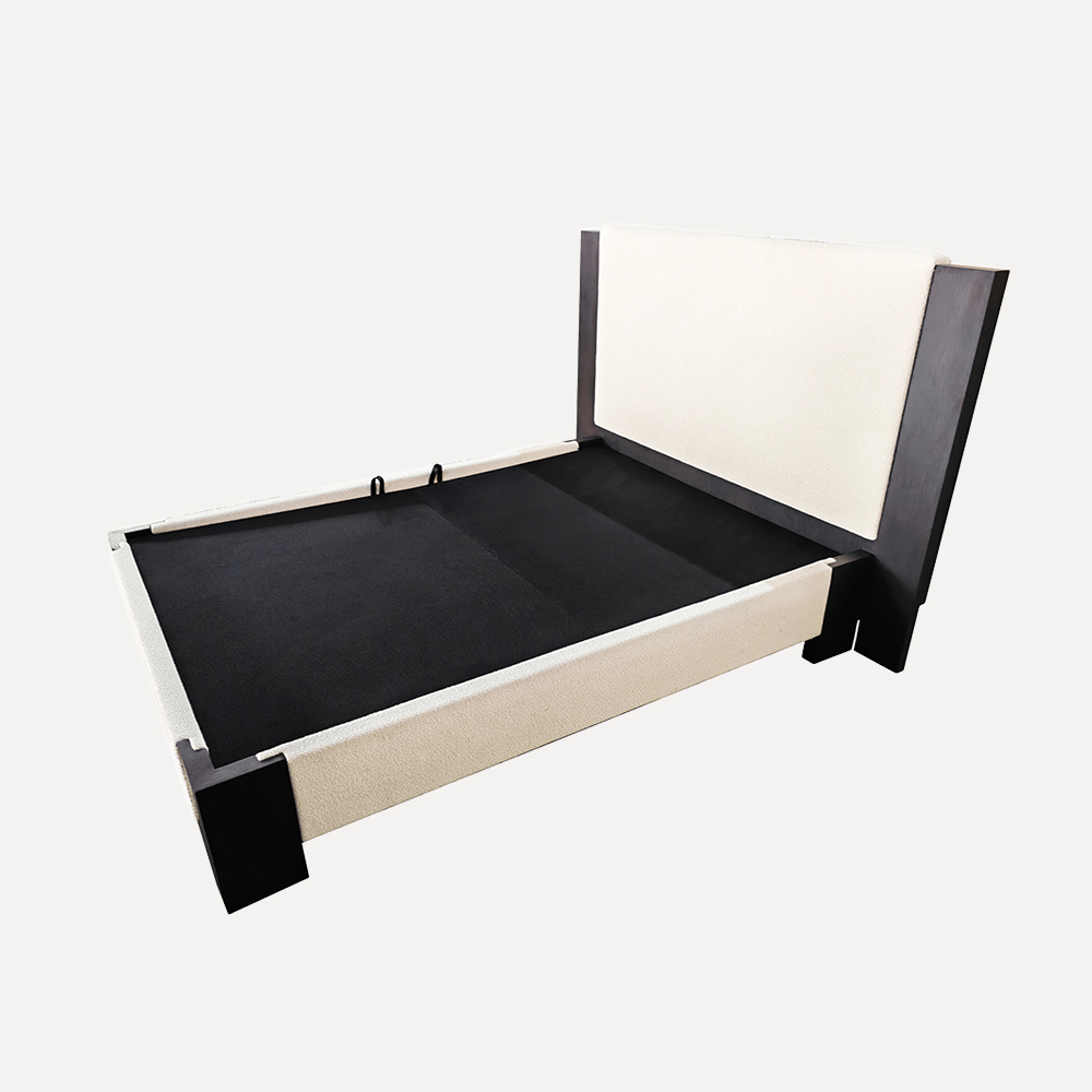 这 modern bed features a simple, minimalist design with a sturdy structure, combining both elegance and durability. Crafted from plywood, solid oak veneer, high-density foam, and fabric, the bed offers a premium look and robust feel suitable for contemporary bedrooms and international markets.