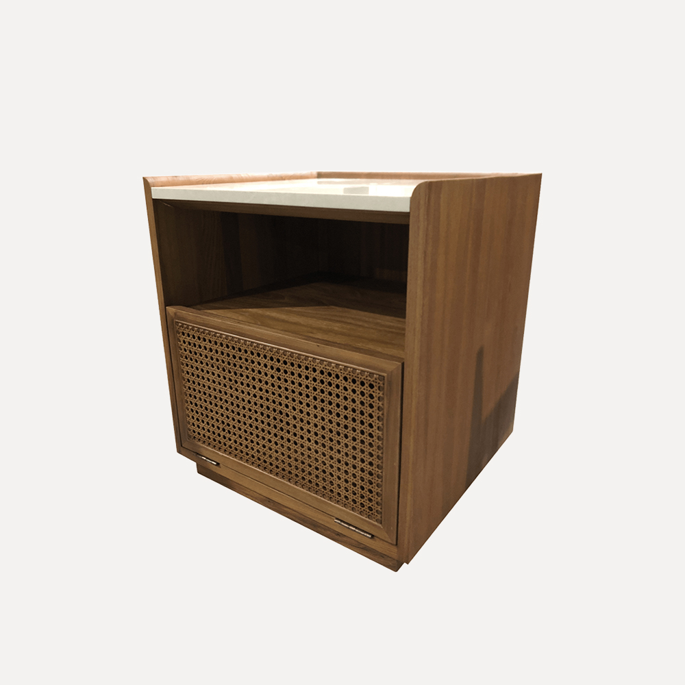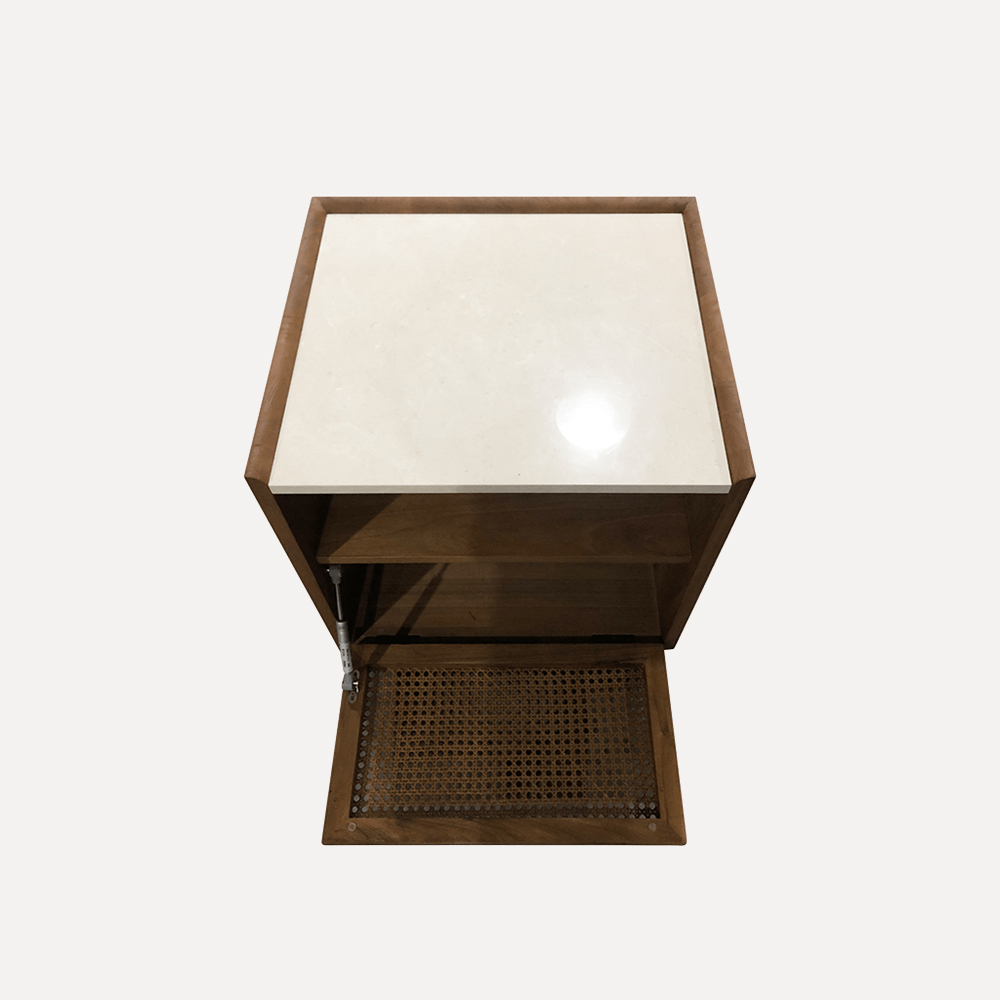 Elevate your bedroom with this refined nightstand, crafted from solid old elm wood, Italian travertine stone, and natural rattan. Designed with careful consideration for harmony with other furniture, the rattan weaving adds subtle texture and warmth to the room.