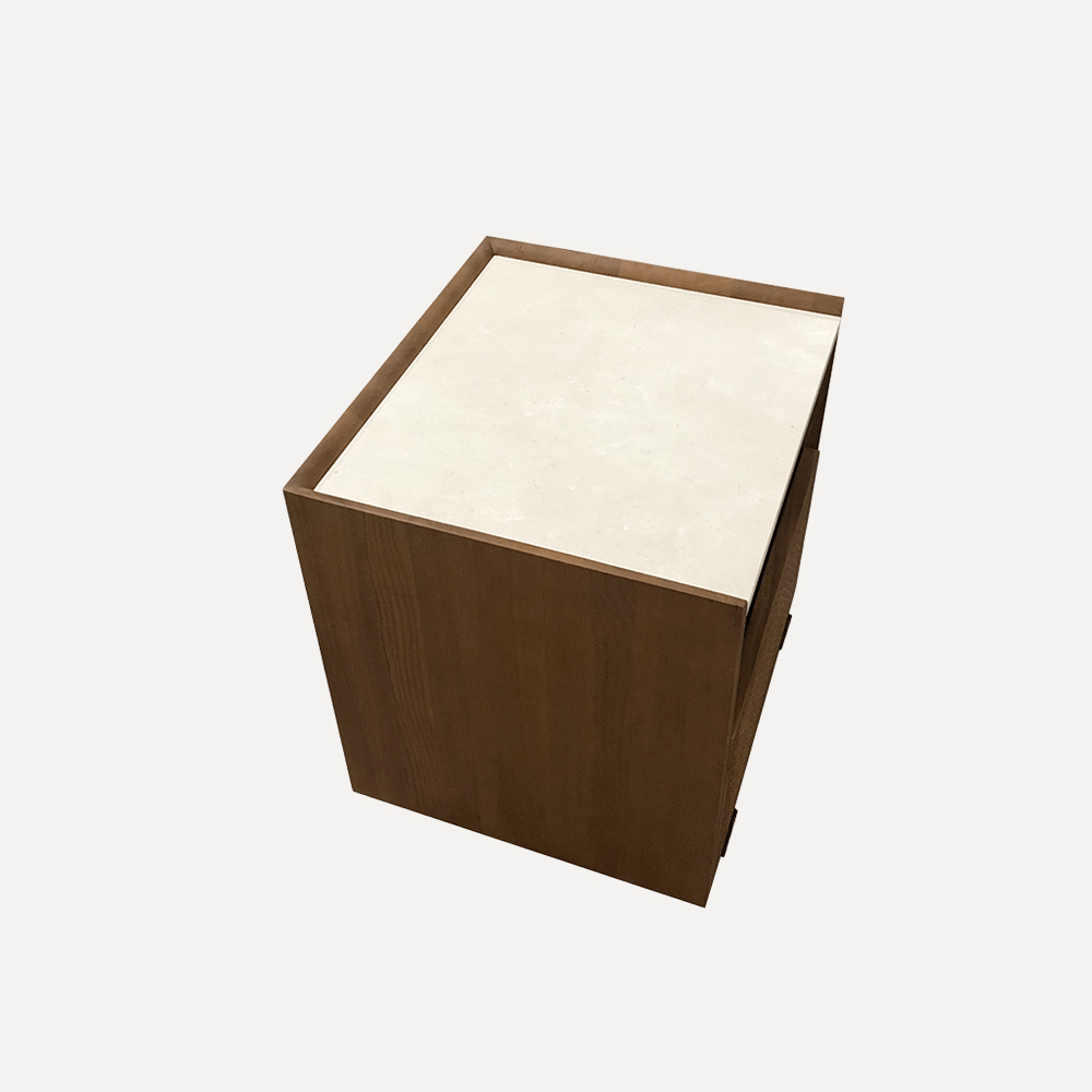 The surface features deep brushed lines, highlighting the natural character of the elm wood. The travertine stone, imported from Italy in a soft beige tone, brings understated luxury and a serene aesthetic to your space. Its minimalist design seamlessly blends with both modern and classic interiors.